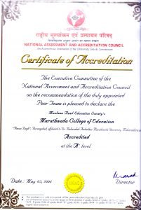 MCE is a premier teaching institute in Marathwada Region which was Accredited as A+ by NAAC. It stands among one of the five A+ Colleges of Education in Maharashtra State and eleven A+ Colleges of Education all over India with an institutional score of CGPA 91% by NAAC in 2004. It is Accredited with CGPA of 3.11 on four point scale at A Grade in 2016.